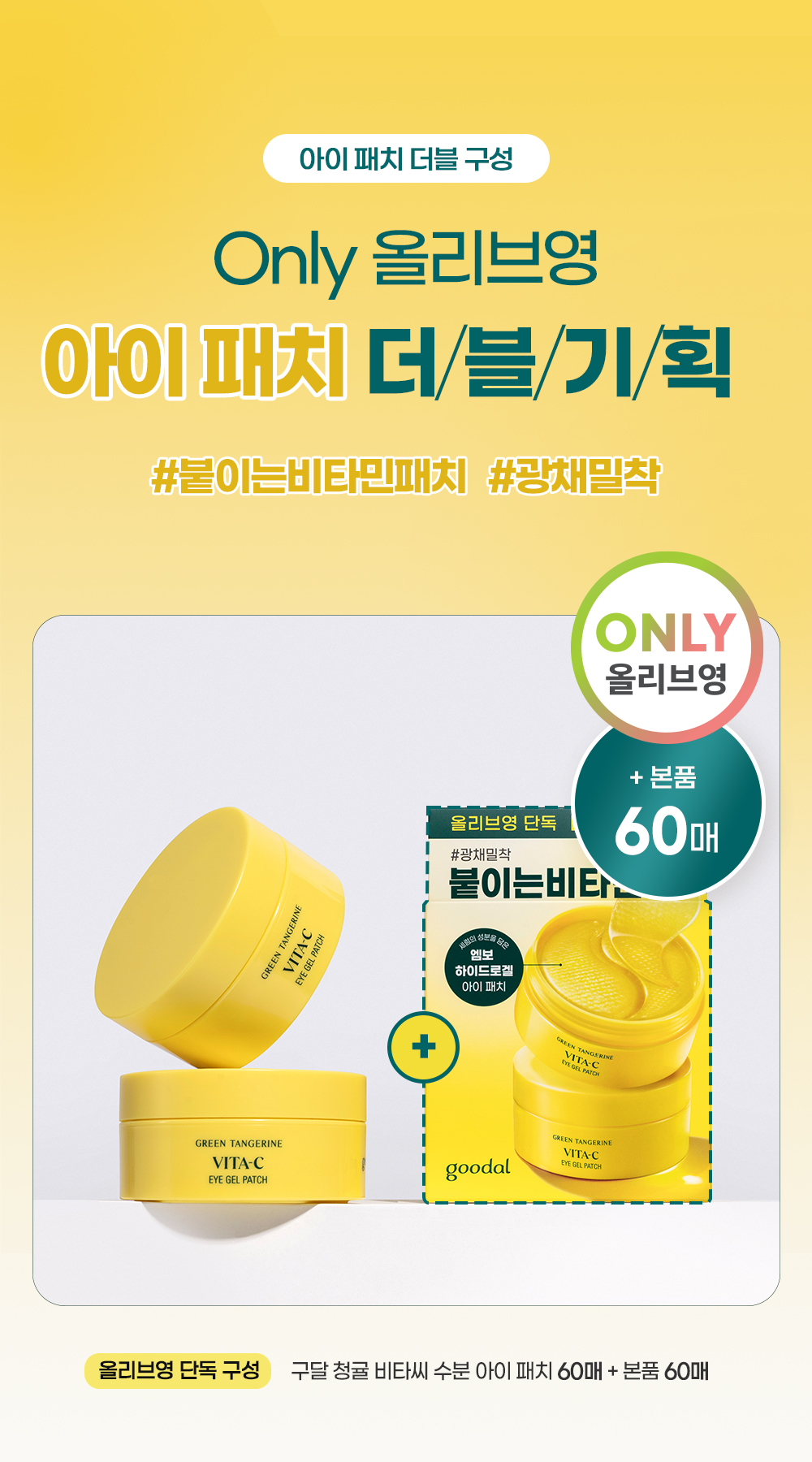 韓國Goodal 青橘維生素 C 保濕眼貼 60片+60片 低刺激補水眼膜,使用5分鐘帶來補水+光彩效果,使用簡單的緊緻凝膠貼片呵護眼周暗沉、疲倦的肌膚。快速吸收的配方,使用只需5分鐘即可看到明顯的豐盈,更明亮的皮膚。 含有韓國濟州島特產青橘提取物(維生素C),將精華的有效成分用凝膠固化製成的水凝膠面膜。青橘子提取物含有比普通橘子多 10 倍的維生素 C,為您帶來最多的亮白能力。從你的眼睛開始,振興和帶回你的臉。